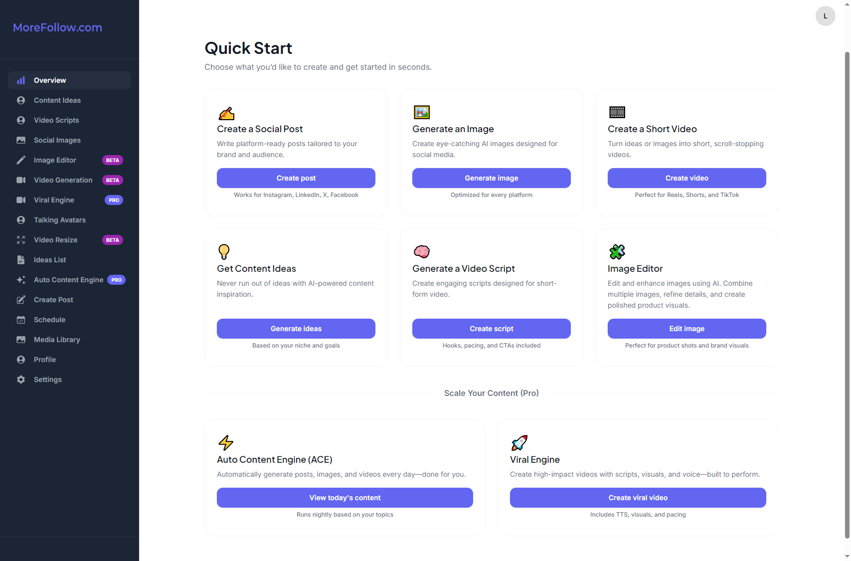Turn ideas into ready-to-publish content in seconds. Hooks, captions, and scripts optimized for Instagram, TikTok, LinkedIn & YouTube.
